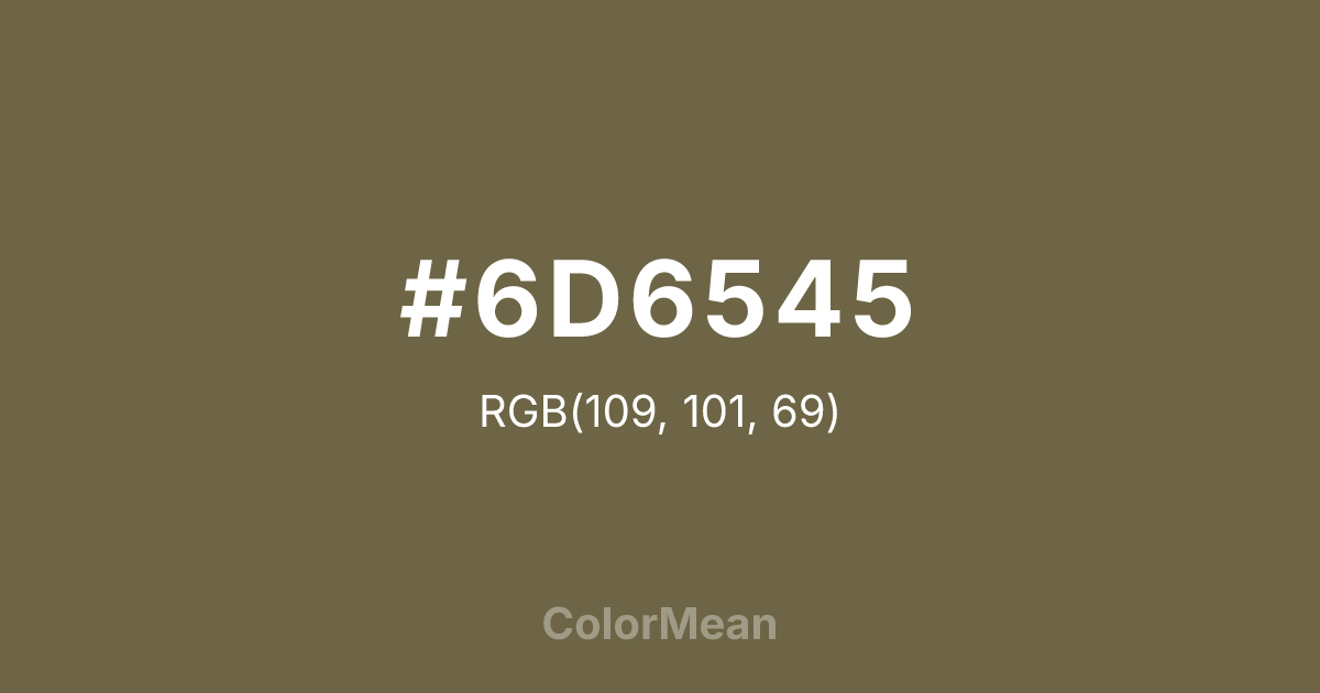 #6D6545 RGB value is (109, 101, 69). The hex color red value is 109, green is 101, and blue is 69. Its HSL format shows a hue of 48°, saturation of 22 percent, and lightness of 35 percent. The CMYK process values are 0 percent, 7 percent, 37 percent, 57 percent.