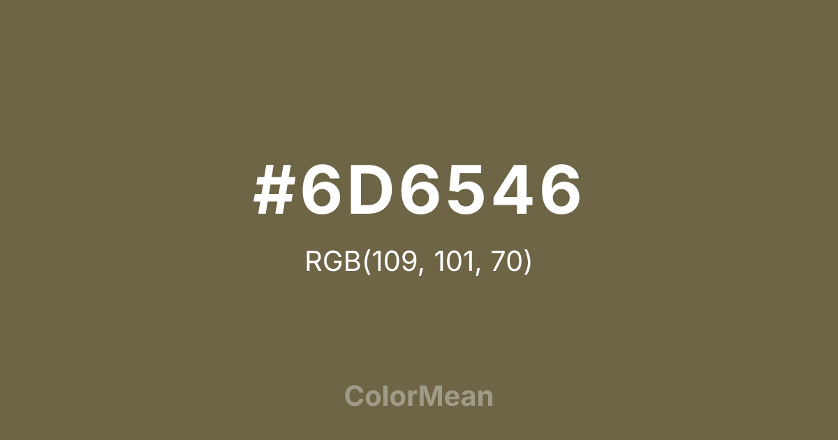 #6D6546 RGB value is (109, 101, 70). The hex color red value is 109, green is 101, and blue is 70. Its HSL format shows a hue of 48°, saturation of 22 percent, and lightness of 35 percent. The CMYK process values are 0 percent, 7 percent, 36 percent, 57 percent.