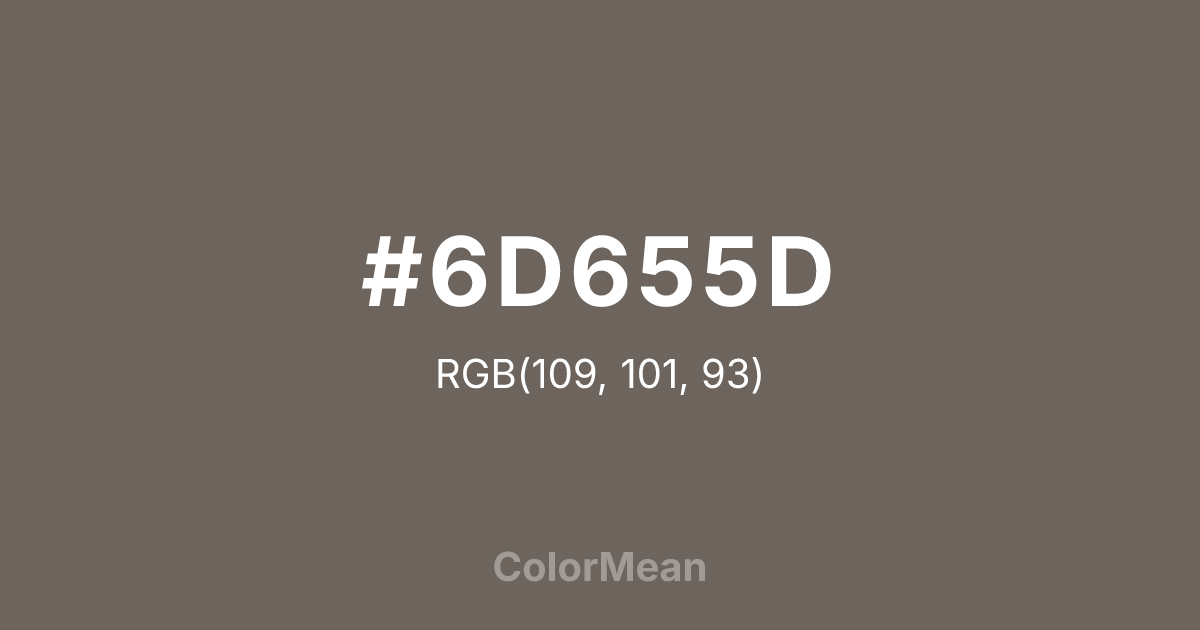 #6D655D RGB value is (109, 101, 93). The hex color red value is 109, green is 101, and blue is 93. Its HSL format shows a hue of 30°, saturation of 8 percent, and lightness of 40 percent. The CMYK process values are 0 percent, 7 percent, 15 percent, 57 percent.