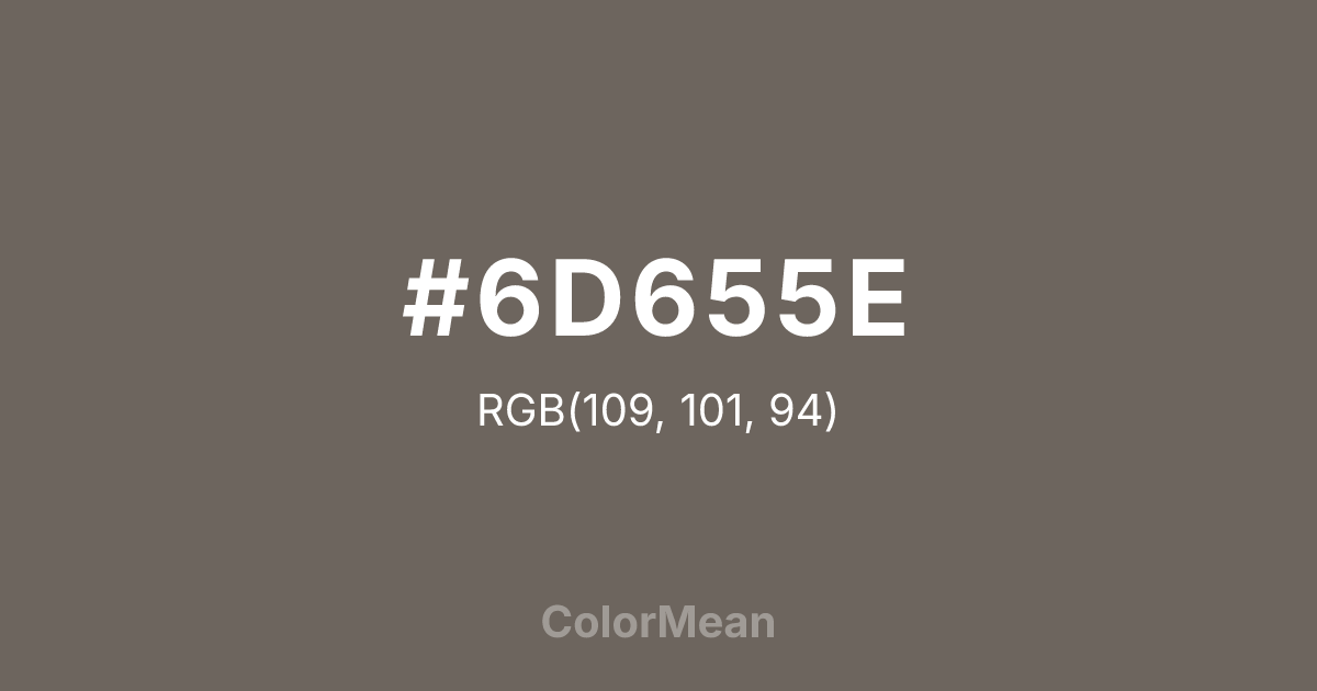 #6D655E RGB value is (109, 101, 94). The hex color red value is 109, green is 101, and blue is 94. Its HSL format shows a hue of 28°, saturation of 7 percent, and lightness of 40 percent. The CMYK process values are 0 percent, 7 percent, 14 percent, 57 percent.