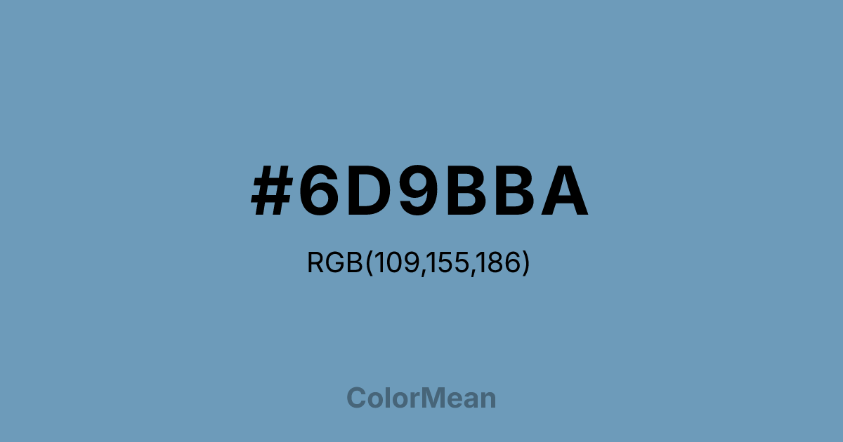 #6D9BBA RGB value is (109, 155, 186). The hex color red value is 109, green is 155, and blue is 186. Its HSL format shows a hue of 204°, saturation of 36 percent, and lightness of 58 percent. The CMYK process values are 41 percent, 17 percent, 0 percent, 27 percent.