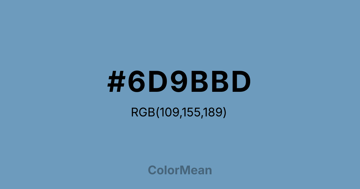 #6D9BBD RGB value is (109, 155, 189). The hex color red value is 109, green is 155, and blue is 189. Its HSL format shows a hue of 206°, saturation of 38 percent, and lightness of 58 percent. The CMYK process values are 42 percent, 18 percent, 0 percent, 26 percent.