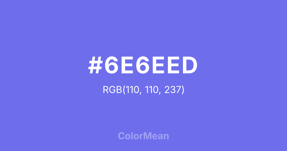 #6E6EED RGB value is (110, 110, 237). The hex color red value is 110, green is 110, and blue is 237. Its HSL format shows a hue of 240°, saturation of 78 percent, and lightness of 68 percent. The CMYK process values are 54 percent, 54 percent, 0 percent, 7 percent.