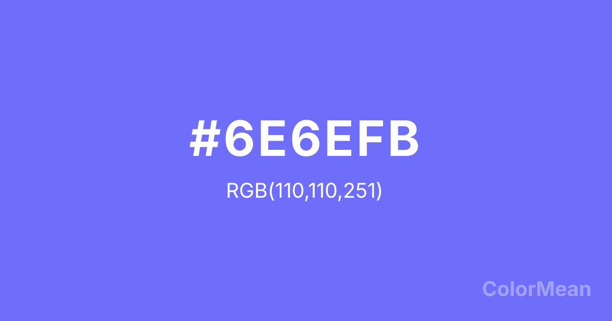 #6E6EFB RGB value is (110, 110, 251). The hex color red value is 110, green is 110, and blue is 251. Its HSL format shows a hue of 240°, saturation of 95 percent, and lightness of 71 percent. The CMYK process values are 56 percent, 56 percent, 0 percent, 2 percent.