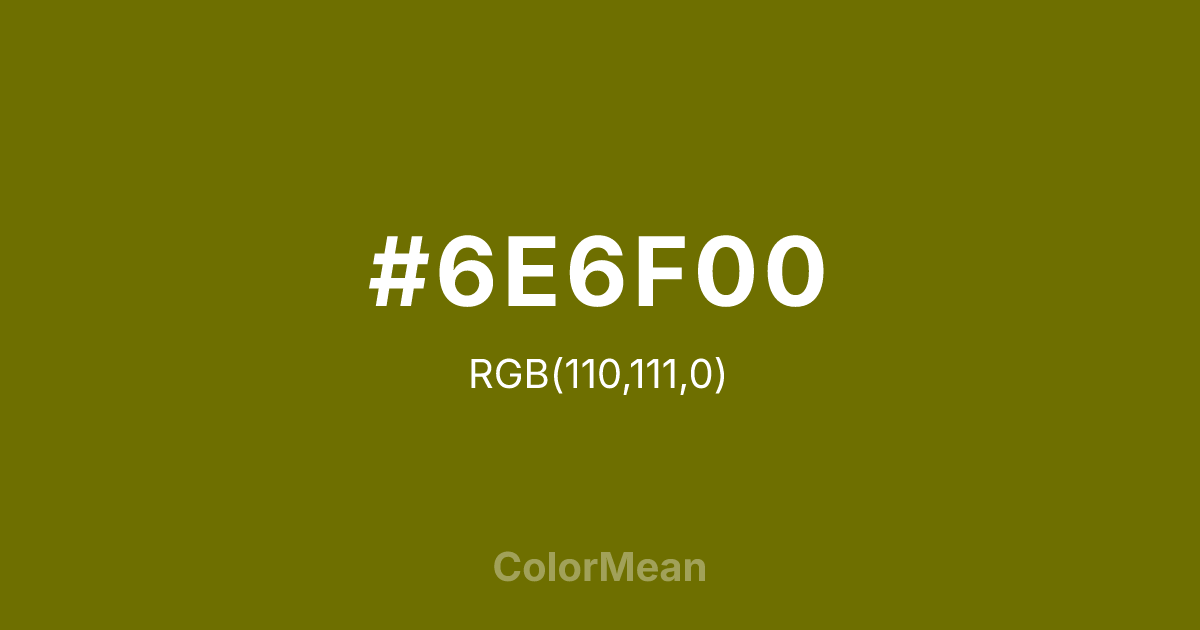 #6E6F00 RGB value is (110, 111, 0). The hex color red value is 110, green is 111, and blue is 0. Its HSL format shows a hue of 61°, saturation of 100 percent, and lightness of 22 percent. The CMYK process values are 1 percent, 0 percent, 100 percent, 56 percent.