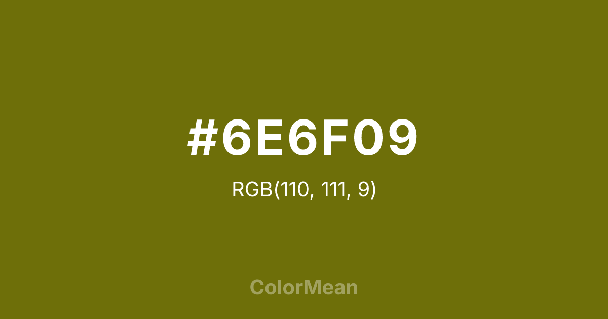 #6E6F09 RGB value is (110, 111, 9). The hex color red value is 110, green is 111, and blue is 9. Its HSL format shows a hue of 61°, saturation of 85 percent, and lightness of 24 percent. The CMYK process values are 1 percent, 0 percent, 92 percent, 56 percent.