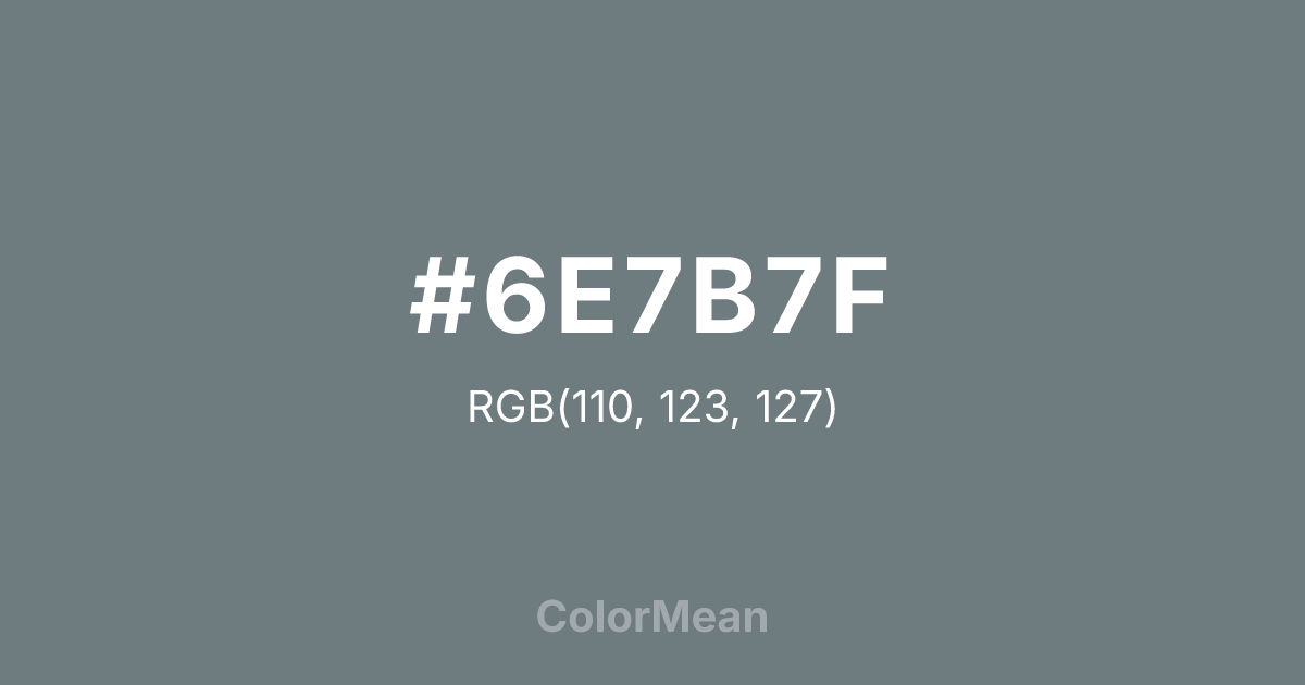 #6E7B7F RGB value is (110, 123, 127). The hex color red value is 110, green is 123, and blue is 127. Its HSL format shows a hue of 194°, saturation of 7 percent, and lightness of 46 percent. The CMYK process values are 13 percent, 3 percent, 0 percent, 50 percent.