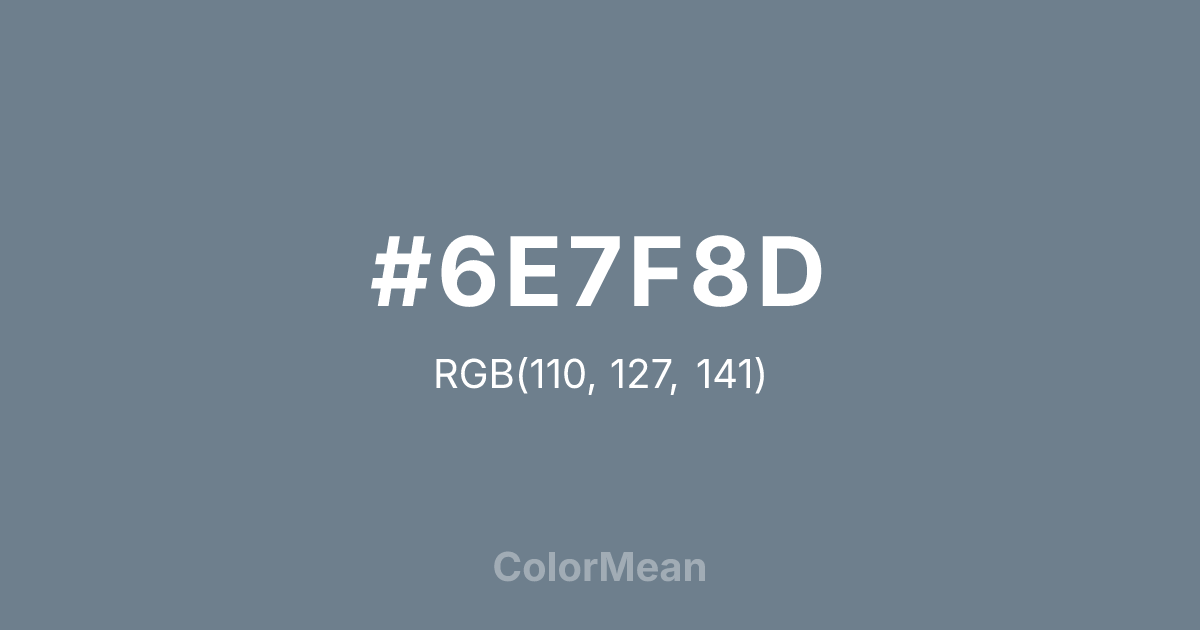 #6E7F8D RGB value is (110, 127, 141). The hex color red value is 110, green is 127, and blue is 141. Its HSL format shows a hue of 207°, saturation of 12 percent, and lightness of 49 percent. The CMYK process values are 22 percent, 10 percent, 0 percent, 45 percent.
