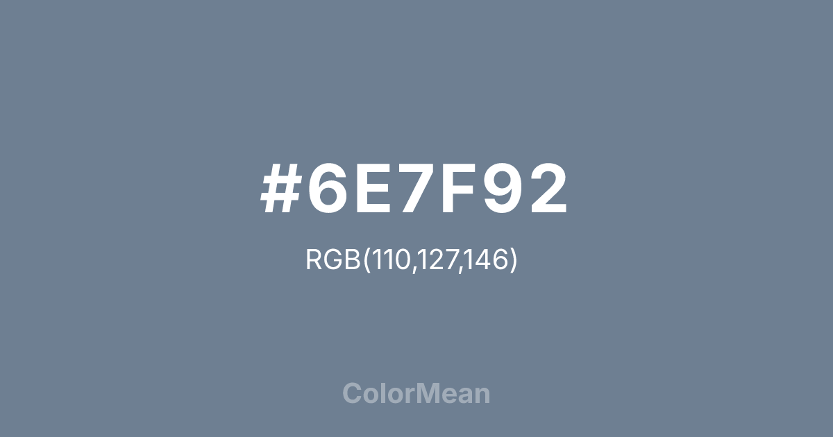#6E7F92 RGB value is (110, 127, 146). The hex color red value is 110, green is 127, and blue is 146. Its HSL format shows a hue of 212°, saturation of 14 percent, and lightness of 50 percent. The CMYK process values are 25 percent, 13 percent, 0 percent, 43 percent.