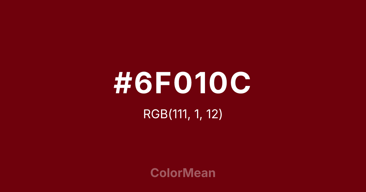 #6F010C RGB value is (111, 1, 12). The hex color red value is 111, green is 1, and blue is 12. Its HSL format shows a hue of 354°, saturation of 98 percent, and lightness of 22 percent. The CMYK process values are 0 percent, 99 percent, 89 percent, 56 percent.