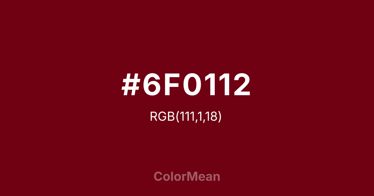 #6F0112 RGB value is (111, 1, 18). The hex color red value is 111, green is 1, and blue is 18. Its HSL format shows a hue of 351°, saturation of 98 percent, and lightness of 22 percent. The CMYK process values are 0 percent, 99 percent, 84 percent, 56 percent.