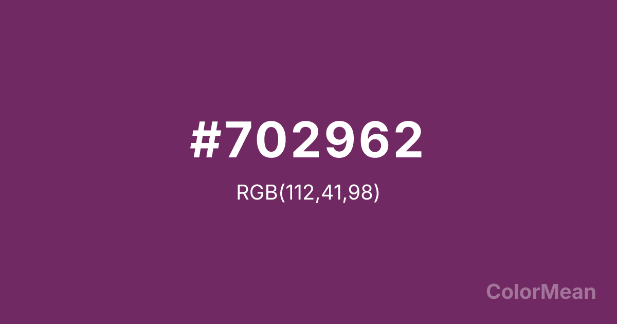 #702962 RGB value is (112, 41, 98). The hex color red value is 112, green is 41, and blue is 98. Its HSL format shows a hue of 312°, saturation of 46 percent, and lightness of 30 percent. The CMYK process values are 0 percent, 63 percent, 13 percent, 56 percent.