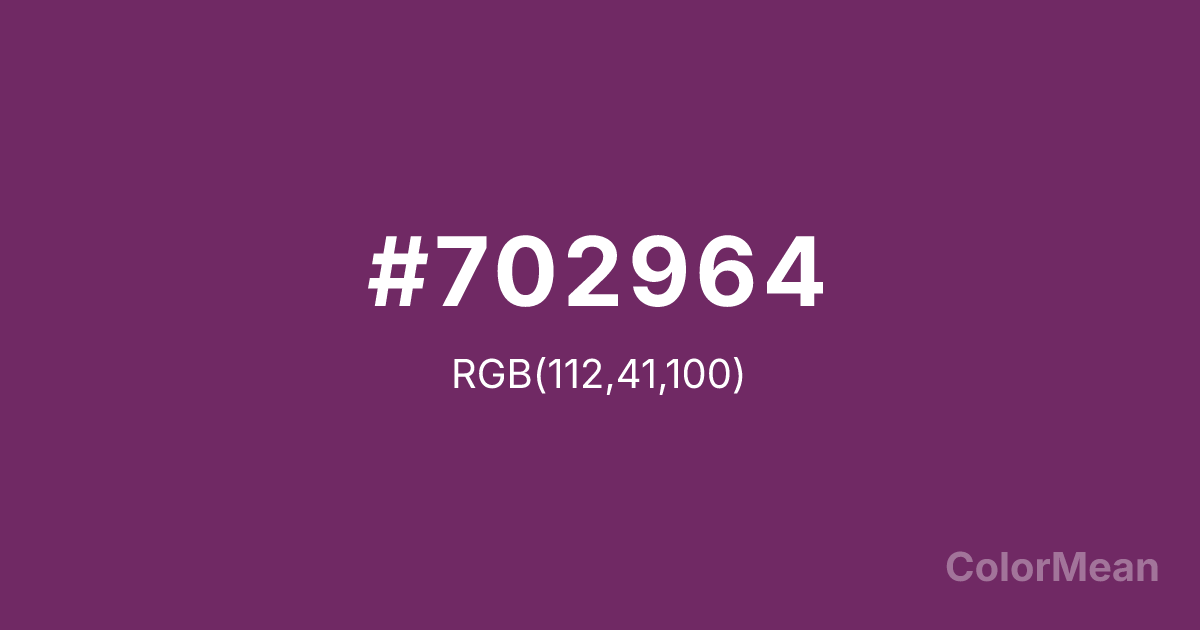 #702964 RGB value is (112, 41, 100). The hex color red value is 112, green is 41, and blue is 100. Its HSL format shows a hue of 310°, saturation of 46 percent, and lightness of 30 percent. The CMYK process values are 0 percent, 63 percent, 11 percent, 56 percent.