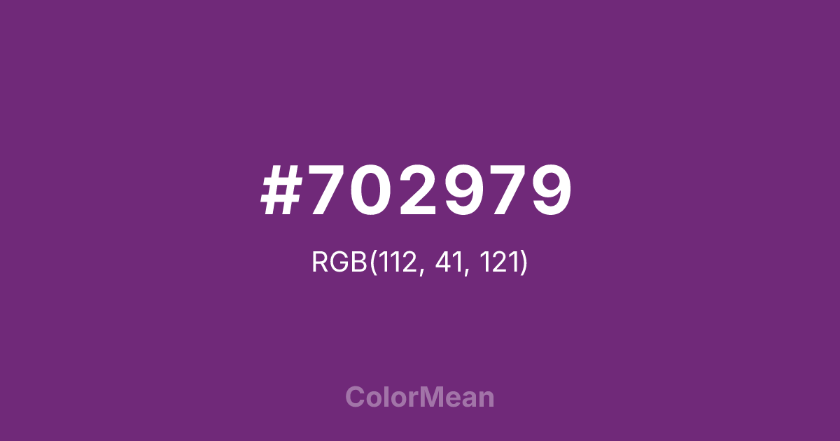 #702979 RGB value is (112, 41, 121). The hex color red value is 112, green is 41, and blue is 121. Its HSL format shows a hue of 293°, saturation of 49 percent, and lightness of 32 percent. The CMYK process values are 7 percent, 66 percent, 0 percent, 53 percent.