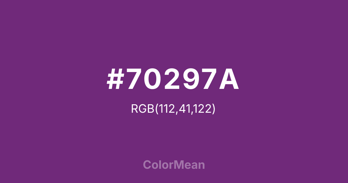 #70297A RGB value is (112, 41, 122). The hex color red value is 112, green is 41, and blue is 122. Its HSL format shows a hue of 293°, saturation of 50 percent, and lightness of 32 percent. The CMYK process values are 8 percent, 66 percent, 0 percent, 52 percent.