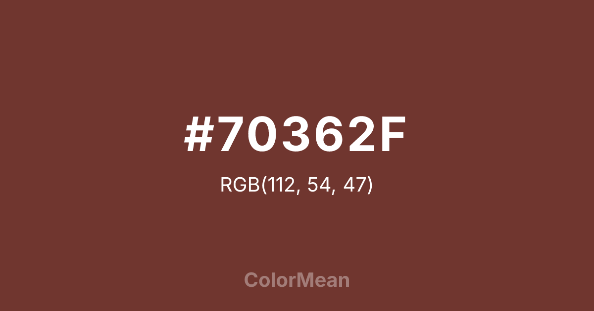 #70362F RGB value is (112, 54, 47). The hex color red value is 112, green is 54, and blue is 47. Its HSL format shows a hue of 6°, saturation of 41 percent, and lightness of 31 percent. The CMYK process values are 0 percent, 52 percent, 58 percent, 56 percent.