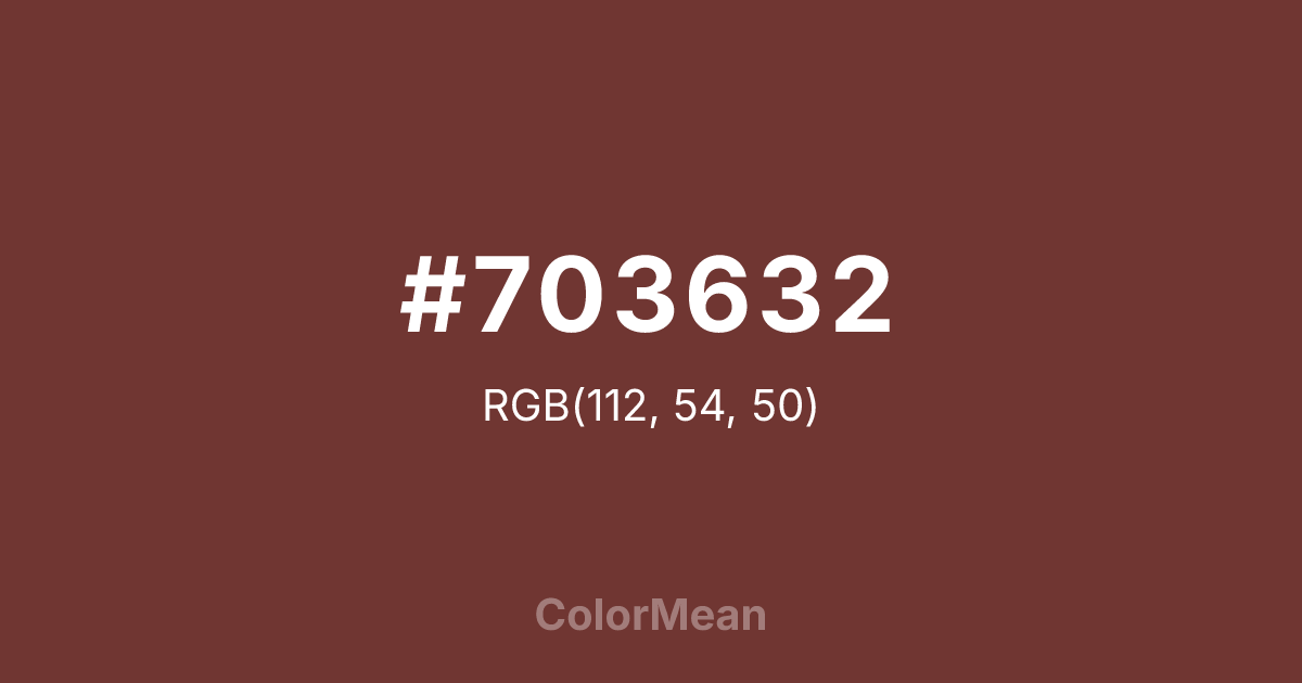 #703632 RGB value is (112, 54, 50). The hex color red value is 112, green is 54, and blue is 50. Its HSL format shows a hue of 4°, saturation of 38 percent, and lightness of 32 percent. The CMYK process values are 0 percent, 52 percent, 55 percent, 56 percent.