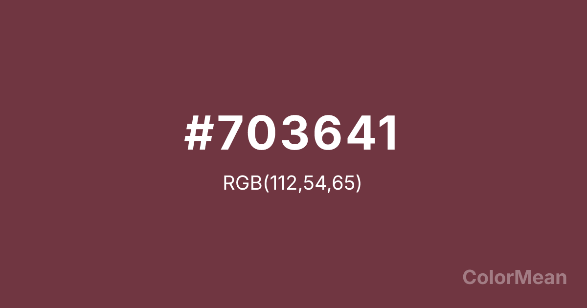 #703641 RGB value is (112, 54, 65). The hex color red value is 112, green is 54, and blue is 65. Its HSL format shows a hue of 349°, saturation of 35 percent, and lightness of 33 percent. The CMYK process values are 0 percent, 52 percent, 42 percent, 56 percent.