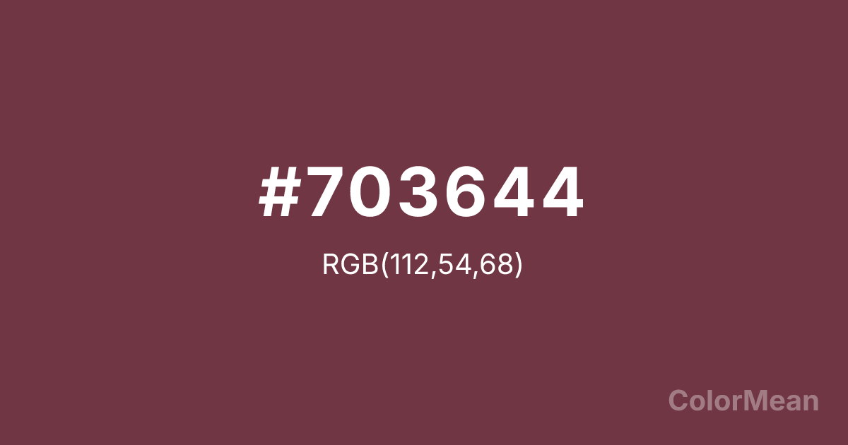 #703644 RGB value is (112, 54, 68). The hex color red value is 112, green is 54, and blue is 68. Its HSL format shows a hue of 346°, saturation of 35 percent, and lightness of 33 percent. The CMYK process values are 0 percent, 52 percent, 39 percent, 56 percent.