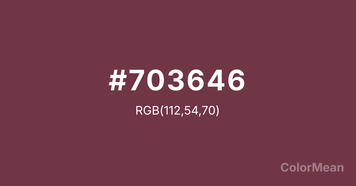 #703646 RGB value is (112, 54, 70). The hex color red value is 112, green is 54, and blue is 70. Its HSL format shows a hue of 343°, saturation of 35 percent, and lightness of 33 percent. The CMYK process values are 0 percent, 52 percent, 37 percent, 56 percent.