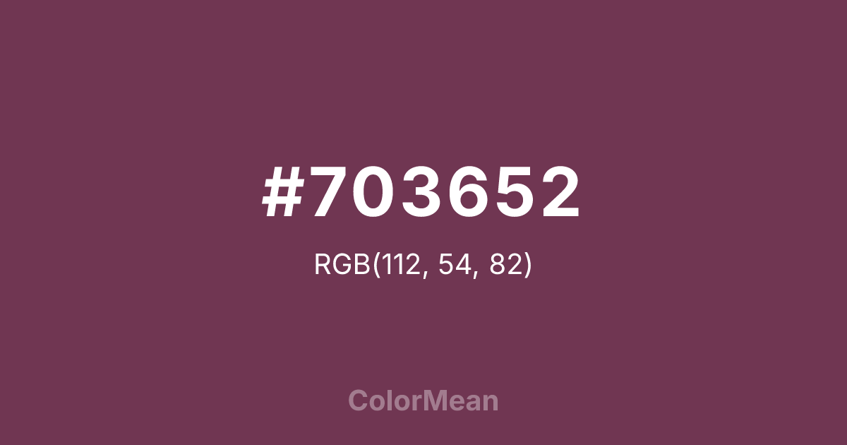 #703652 RGB value is (112, 54, 82). The hex color red value is 112, green is 54, and blue is 82. Its HSL format shows a hue of 331°, saturation of 35 percent, and lightness of 33 percent. The CMYK process values are 0 percent, 52 percent, 27 percent, 56 percent.
