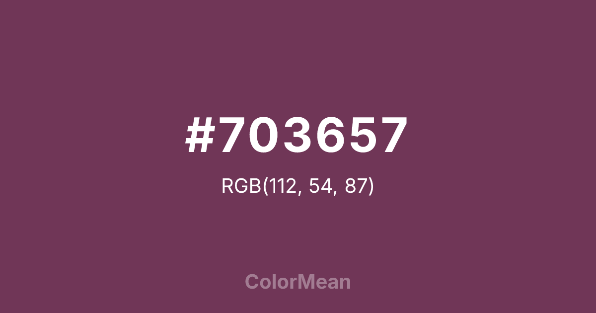 #703657 RGB value is (112, 54, 87). The hex color red value is 112, green is 54, and blue is 87. Its HSL format shows a hue of 326°, saturation of 35 percent, and lightness of 33 percent. The CMYK process values are 0 percent, 52 percent, 22 percent, 56 percent.
