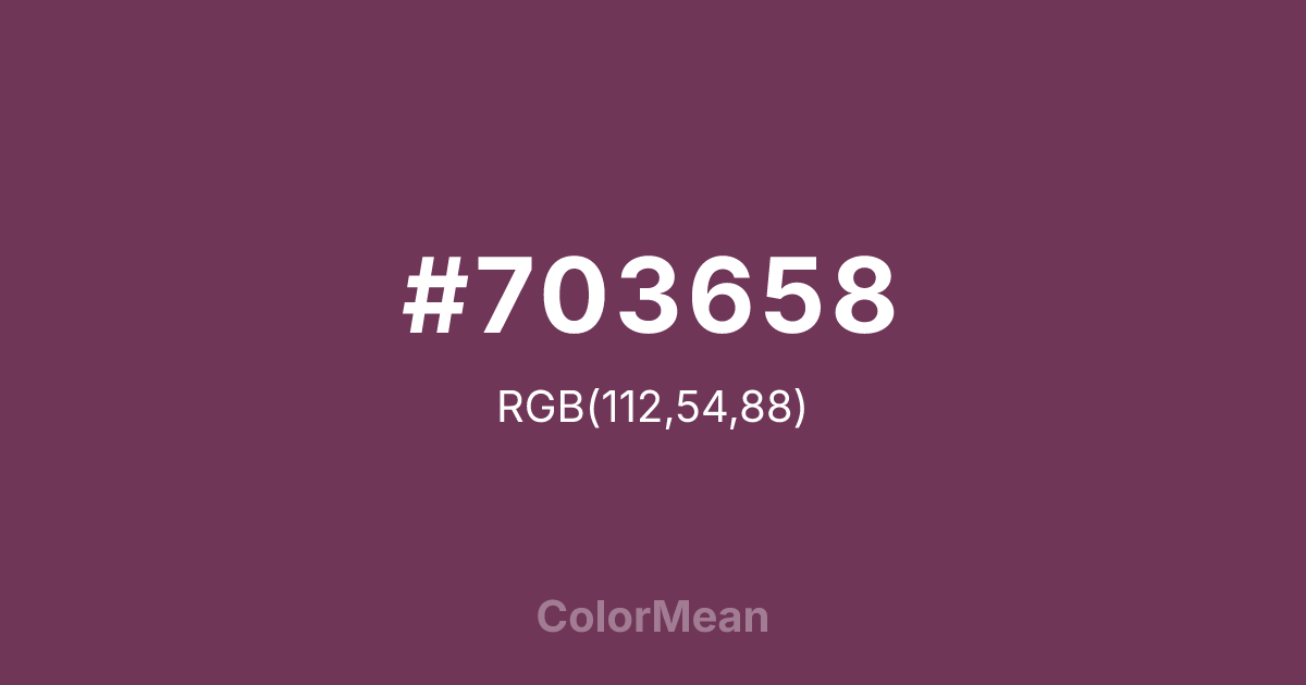 #703658 RGB value is (112, 54, 88). The hex color red value is 112, green is 54, and blue is 88. Its HSL format shows a hue of 325°, saturation of 35 percent, and lightness of 33 percent. The CMYK process values are 0 percent, 52 percent, 21 percent, 56 percent.