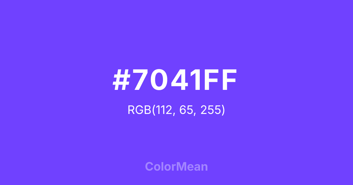 #7041FF RGB value is (112, 65, 255). The hex color red value is 112, green is 65, and blue is 255. Its HSL format shows a hue of 255°, saturation of 100 percent, and lightness of 63 percent. The CMYK process values are 56 percent, 75 percent, 0 percent, 0 percent.