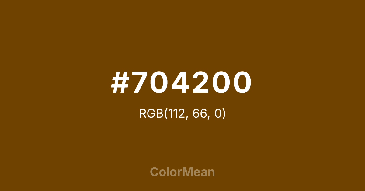 #704200 RGB value is (112, 66, 0). The hex color red value is 112, green is 66, and blue is 0. Its HSL format shows a hue of 35°, saturation of 100 percent, and lightness of 22 percent. The CMYK process values are 0 percent, 41 percent, 100 percent, 56 percent.