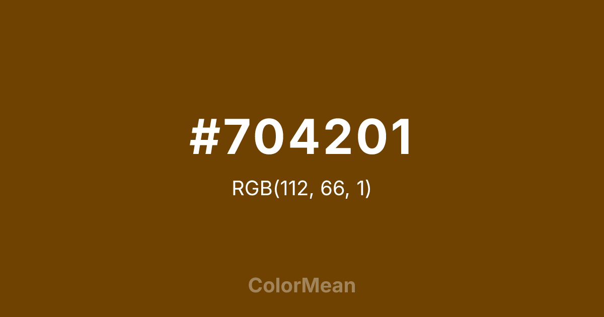 #704201 RGB value is (112, 66, 1). The hex color red value is 112, green is 66, and blue is 1. Its HSL format shows a hue of 35°, saturation of 98 percent, and lightness of 22 percent. The CMYK process values are 0 percent, 41 percent, 99 percent, 56 percent.
