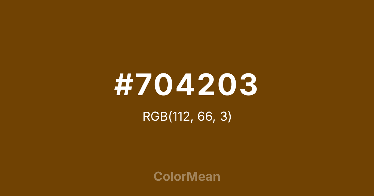 #704203 RGB value is (112, 66, 3). The hex color red value is 112, green is 66, and blue is 3. Its HSL format shows a hue of 35°, saturation of 95 percent, and lightness of 23 percent. The CMYK process values are 0 percent, 41 percent, 97 percent, 56 percent.