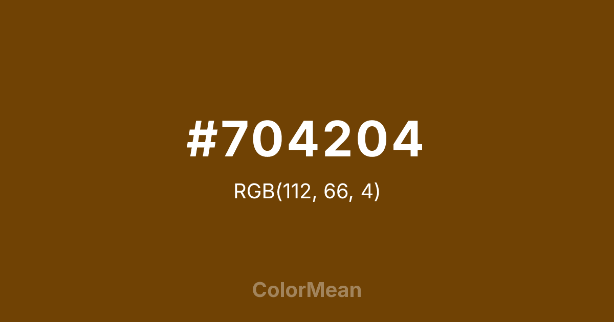 #704204 RGB value is (112, 66, 4). The hex color red value is 112, green is 66, and blue is 4. Its HSL format shows a hue of 34°, saturation of 93 percent, and lightness of 23 percent. The CMYK process values are 0 percent, 41 percent, 96 percent, 56 percent.
