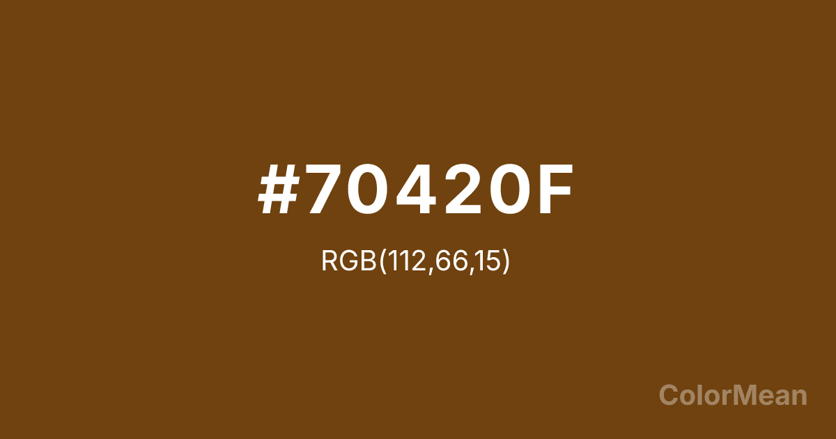 #70420F RGB value is (112, 66, 15). The hex color red value is 112, green is 66, and blue is 15. Its HSL format shows a hue of 32°, saturation of 76 percent, and lightness of 25 percent. The CMYK process values are 0 percent, 41 percent, 87 percent, 56 percent.