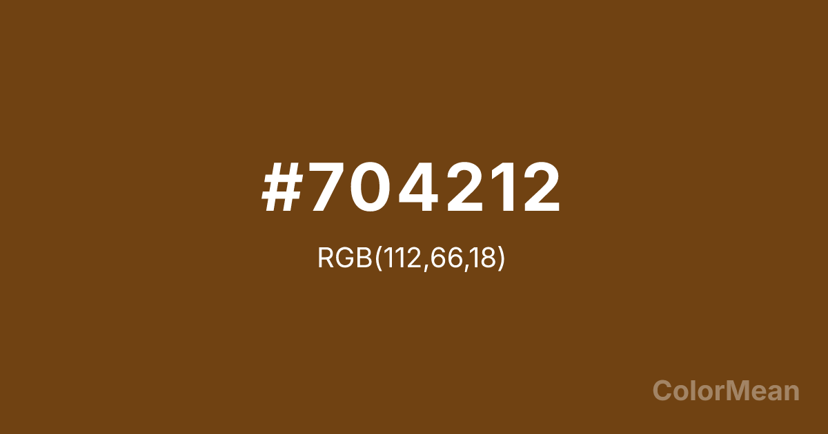#704212 RGB value is (112, 66, 18). The hex color red value is 112, green is 66, and blue is 18. Its HSL format shows a hue of 31°, saturation of 72 percent, and lightness of 25 percent. The CMYK process values are 0 percent, 41 percent, 84 percent, 56 percent.