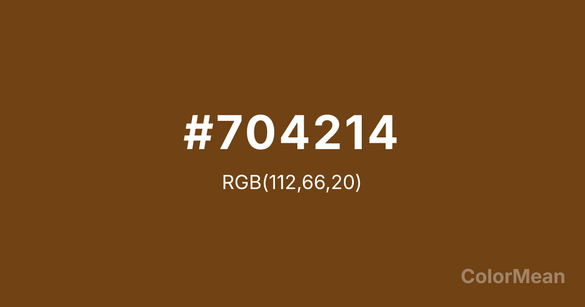 Sepia (#704214) RGB value is (112, 66, 20). The hex color red value is 112, green is 66, and blue is 20. Its HSL format shows a hue of 30°, saturation of 70 percent, and lightness of 26 percent. The CMYK process values are 0 percent, 41 percent, 82 percent, 56 percent.