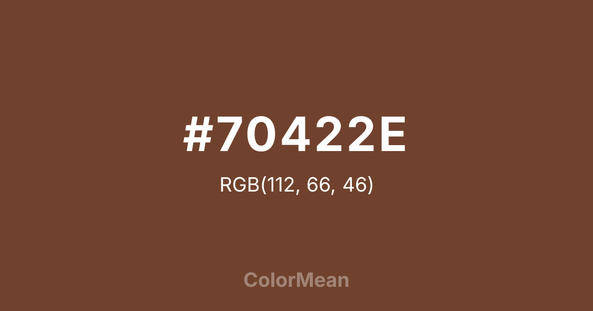 #70422E RGB value is (112, 66, 46). The hex color red value is 112, green is 66, and blue is 46. Its HSL format shows a hue of 18°, saturation of 42 percent, and lightness of 31 percent. The CMYK process values are 0 percent, 41 percent, 59 percent, 56 percent.