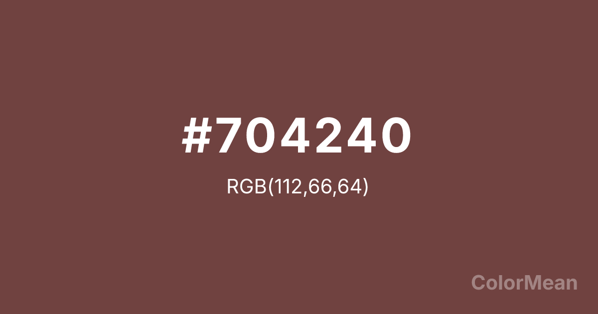 #704240 RGB value is (112, 66, 64). The hex color red value is 112, green is 66, and blue is 64. Its HSL format shows a hue of 3°, saturation of 27 percent, and lightness of 35 percent. The CMYK process values are 0 percent, 41 percent, 43 percent, 56 percent.