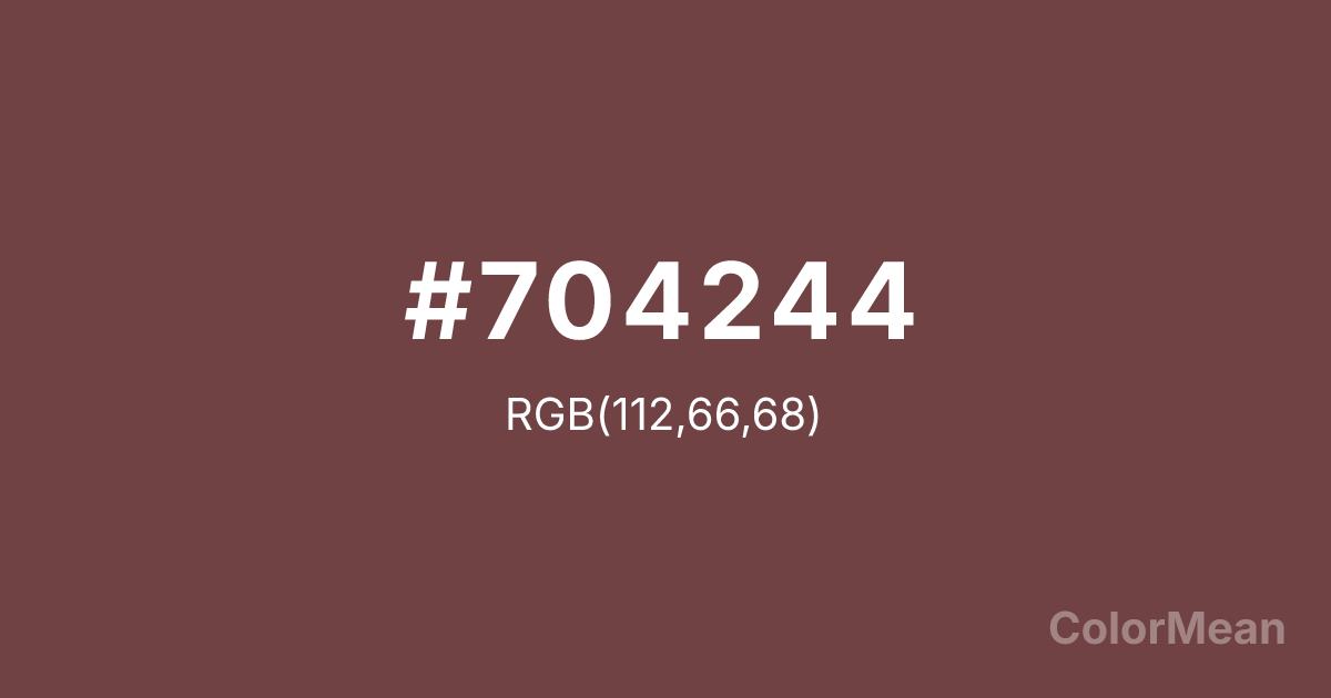 #704244 RGB value is (112, 66, 68). The hex color red value is 112, green is 66, and blue is 68. Its HSL format shows a hue of 357°, saturation of 26 percent, and lightness of 35 percent. The CMYK process values are 0 percent, 41 percent, 39 percent, 56 percent.