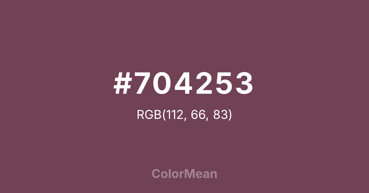 #704253 RGB value is (112, 66, 83). The hex color red value is 112, green is 66, and blue is 83. Its HSL format shows a hue of 338°, saturation of 26 percent, and lightness of 35 percent. The CMYK process values are 0 percent, 41 percent, 26 percent, 56 percent.