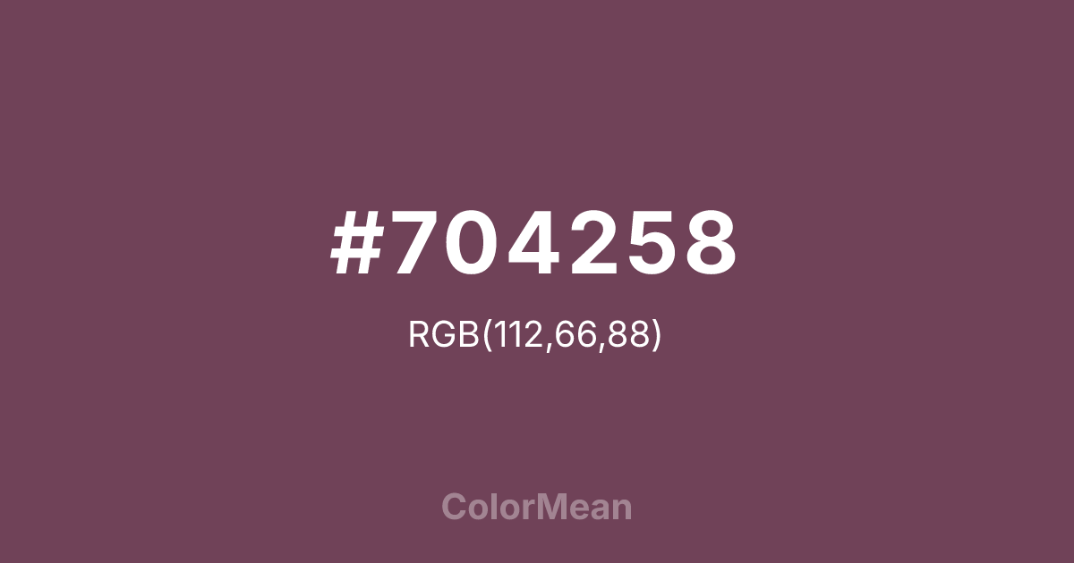 #704258 RGB value is (112, 66, 88). The hex color red value is 112, green is 66, and blue is 88. Its HSL format shows a hue of 331°, saturation of 26 percent, and lightness of 35 percent. The CMYK process values are 0 percent, 41 percent, 21 percent, 56 percent.