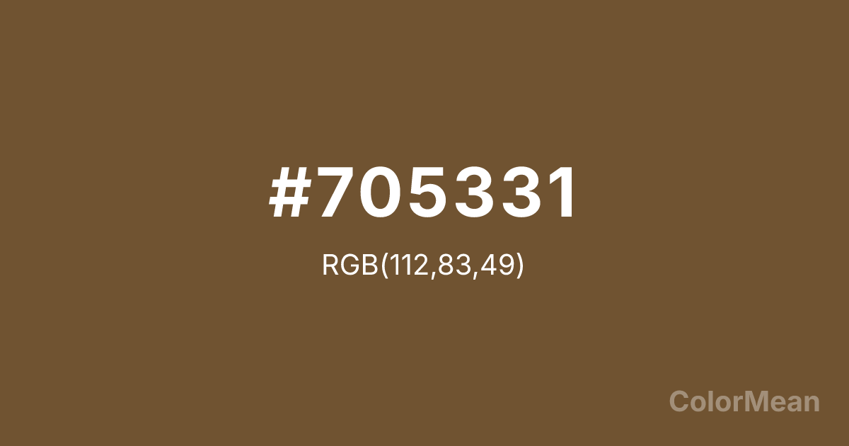 #705331 RGB value is (112, 83, 49). The hex color red value is 112, green is 83, and blue is 49. Its HSL format shows a hue of 32°, saturation of 39 percent, and lightness of 32 percent. The CMYK process values are 0 percent, 26 percent, 56 percent, 56 percent.