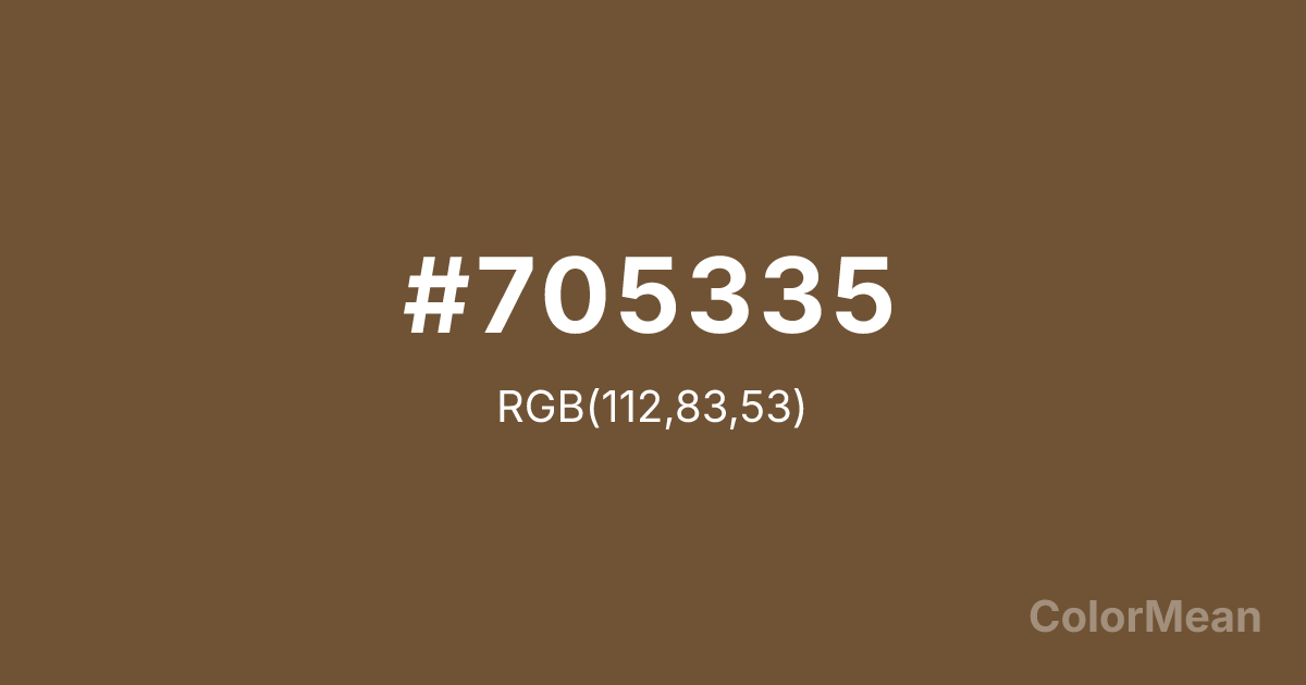 Pearl Gold (#705335) RGB value is (112, 83, 53). The hex color red value is 112, green is 83, and blue is 53. Its HSL format shows a hue of 31°, saturation of 36 percent, and lightness of 32 percent. The CMYK process values are 0 percent, 26 percent, 53 percent, 56 percent.