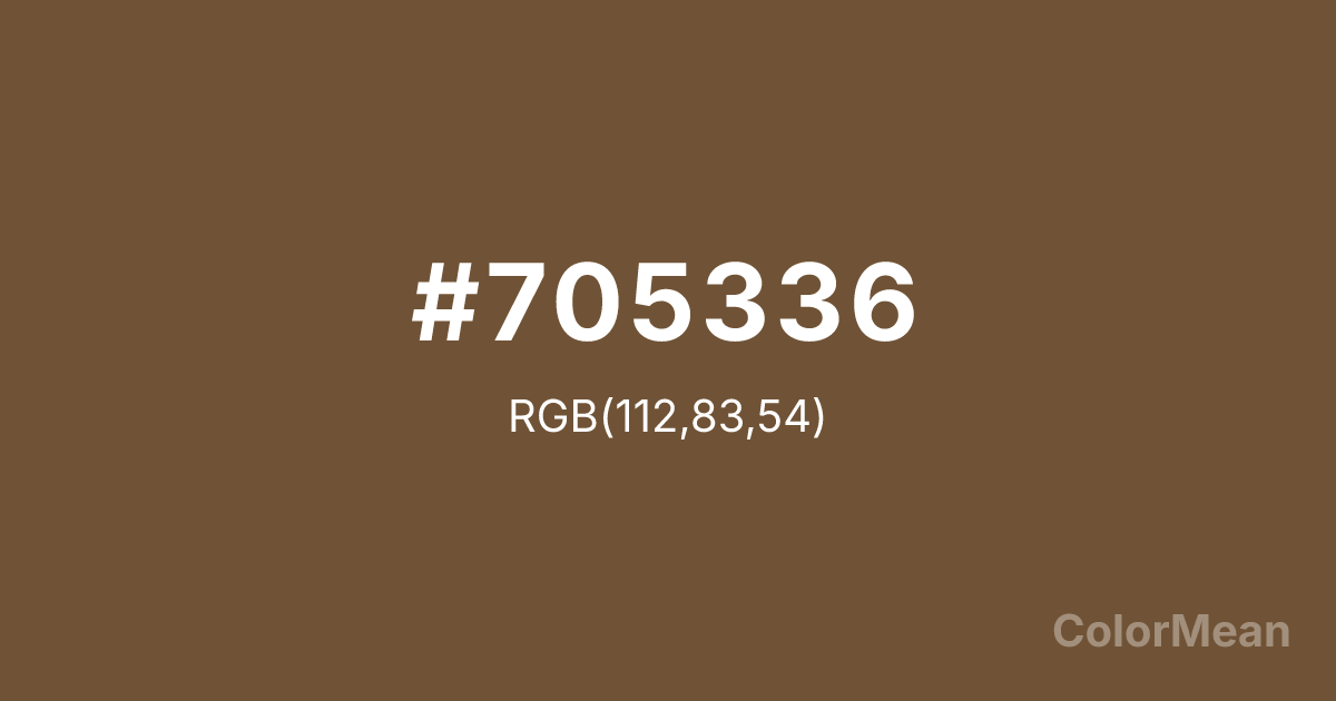 #705336 RGB value is (112, 83, 54). The hex color red value is 112, green is 83, and blue is 54. Its HSL format shows a hue of 30°, saturation of 35 percent, and lightness of 33 percent. The CMYK process values are 0 percent, 26 percent, 52 percent, 56 percent.