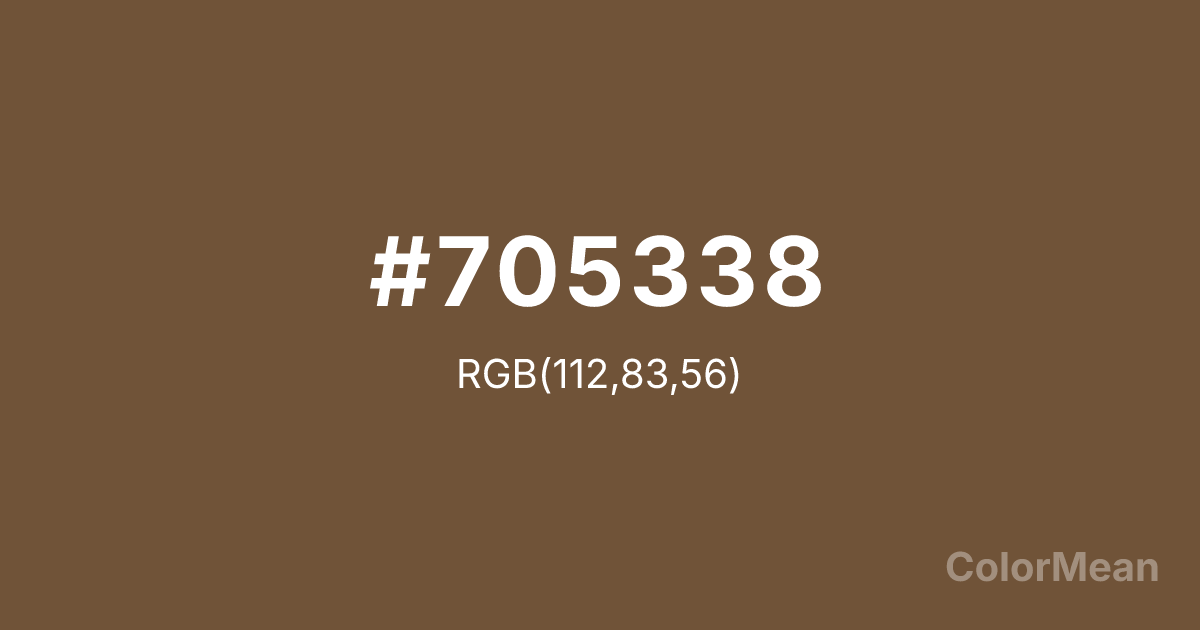 #705338 RGB value is (112, 83, 56). The hex color red value is 112, green is 83, and blue is 56. Its HSL format shows a hue of 29°, saturation of 33 percent, and lightness of 33 percent. The CMYK process values are 0 percent, 26 percent, 50 percent, 56 percent.