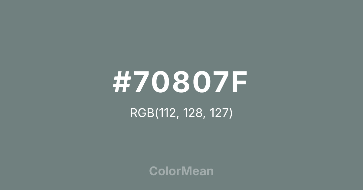 #70807F RGB value is (112, 128, 127). The hex color red value is 112, green is 128, and blue is 127. Its HSL format shows a hue of 176°, saturation of 7 percent, and lightness of 47 percent. The CMYK process values are 13 percent, 0 percent, 1 percent, 50 percent.