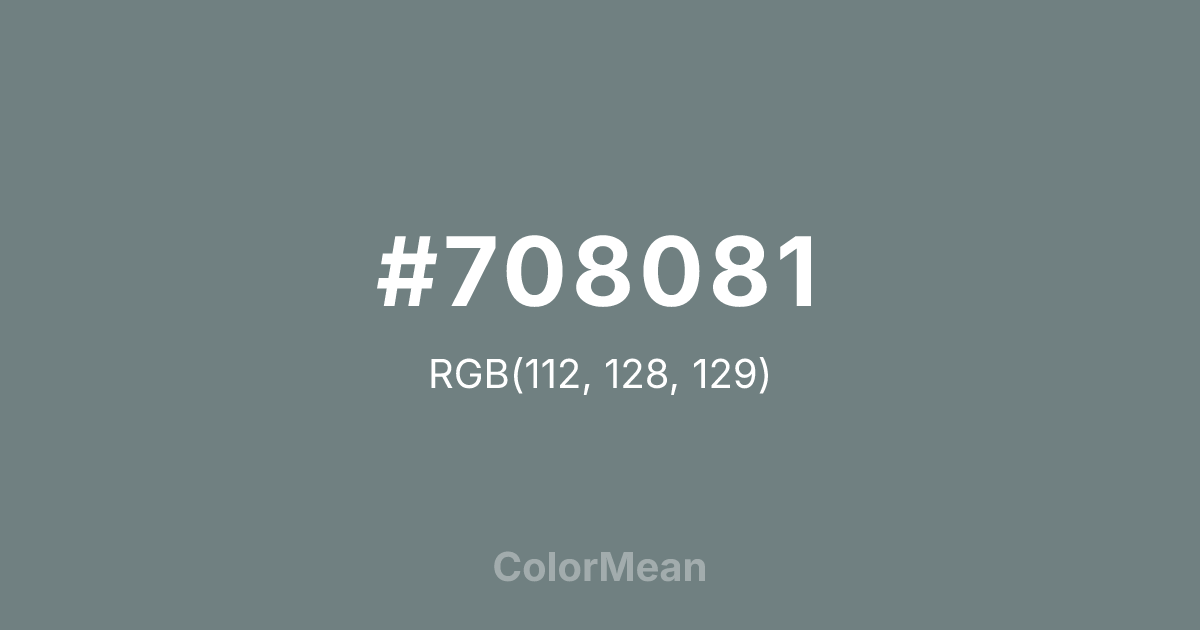 #708081 RGB value is (112, 128, 129). The hex color red value is 112, green is 128, and blue is 129. Its HSL format shows a hue of 184°, saturation of 7 percent, and lightness of 47 percent. The CMYK process values are 13 percent, 1 percent, 0 percent, 49 percent.