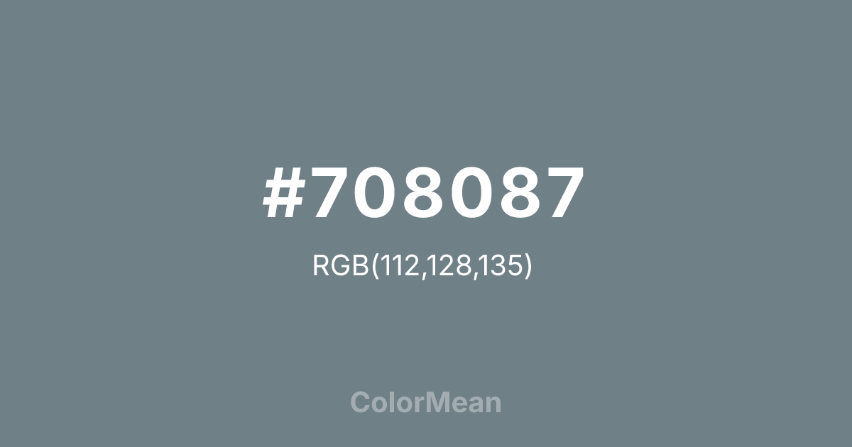 #708087 RGB value is (112, 128, 135). The hex color red value is 112, green is 128, and blue is 135. Its HSL format shows a hue of 198°, saturation of 9 percent, and lightness of 48 percent. The CMYK process values are 17 percent, 5 percent, 0 percent, 47 percent.