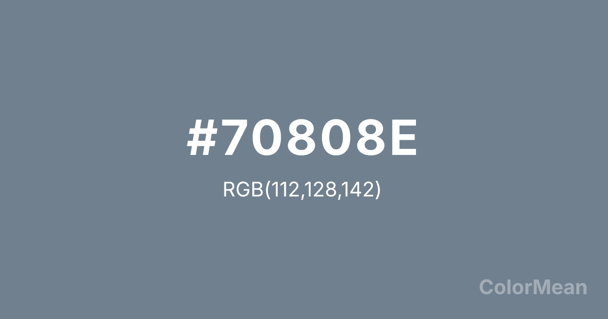 #70808E RGB value is (112, 128, 142). The hex color red value is 112, green is 128, and blue is 142. Its HSL format shows a hue of 208°, saturation of 12 percent, and lightness of 50 percent. The CMYK process values are 21 percent, 10 percent, 0 percent, 44 percent.