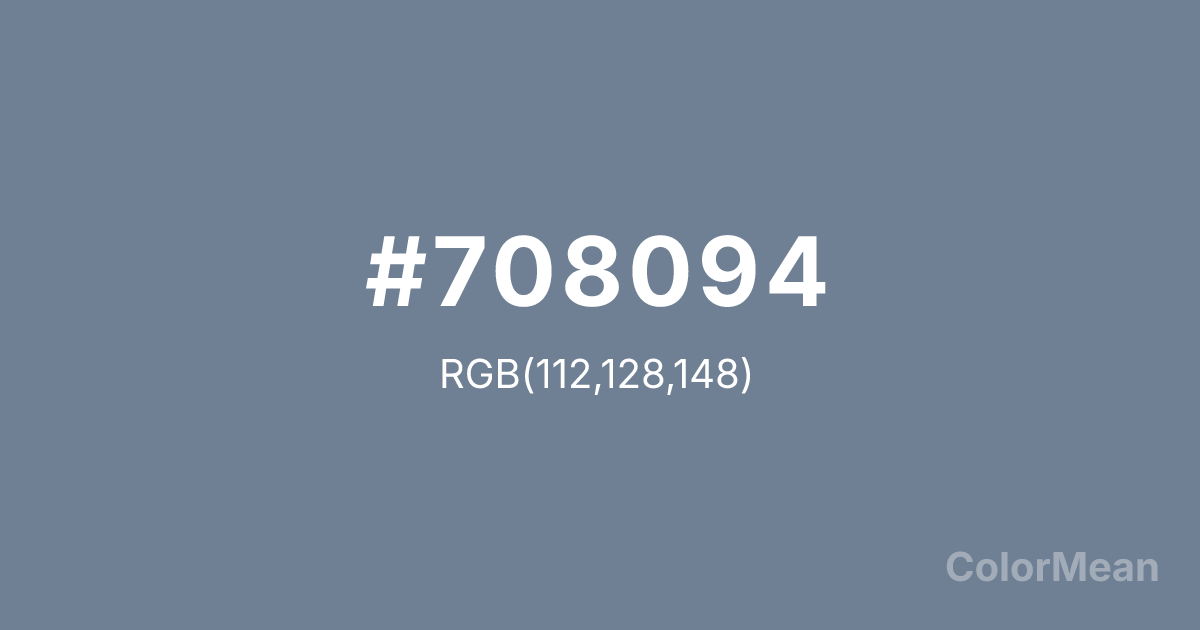 #708094 RGB value is (112, 128, 148). The hex color red value is 112, green is 128, and blue is 148. Its HSL format shows a hue of 213°, saturation of 14 percent, and lightness of 51 percent. The CMYK process values are 24 percent, 14 percent, 0 percent, 42 percent.