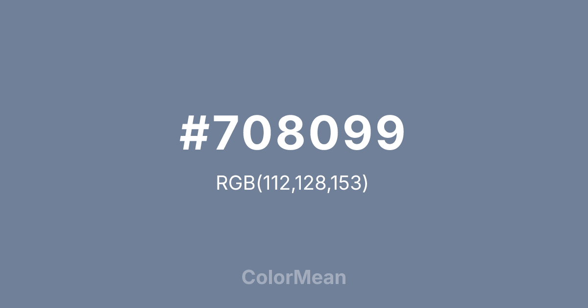 #708099 RGB value is (112, 128, 153). The hex color red value is 112, green is 128, and blue is 153. Its HSL format shows a hue of 217°, saturation of 17 percent, and lightness of 52 percent. The CMYK process values are 27 percent, 16 percent, 0 percent, 40 percent.
